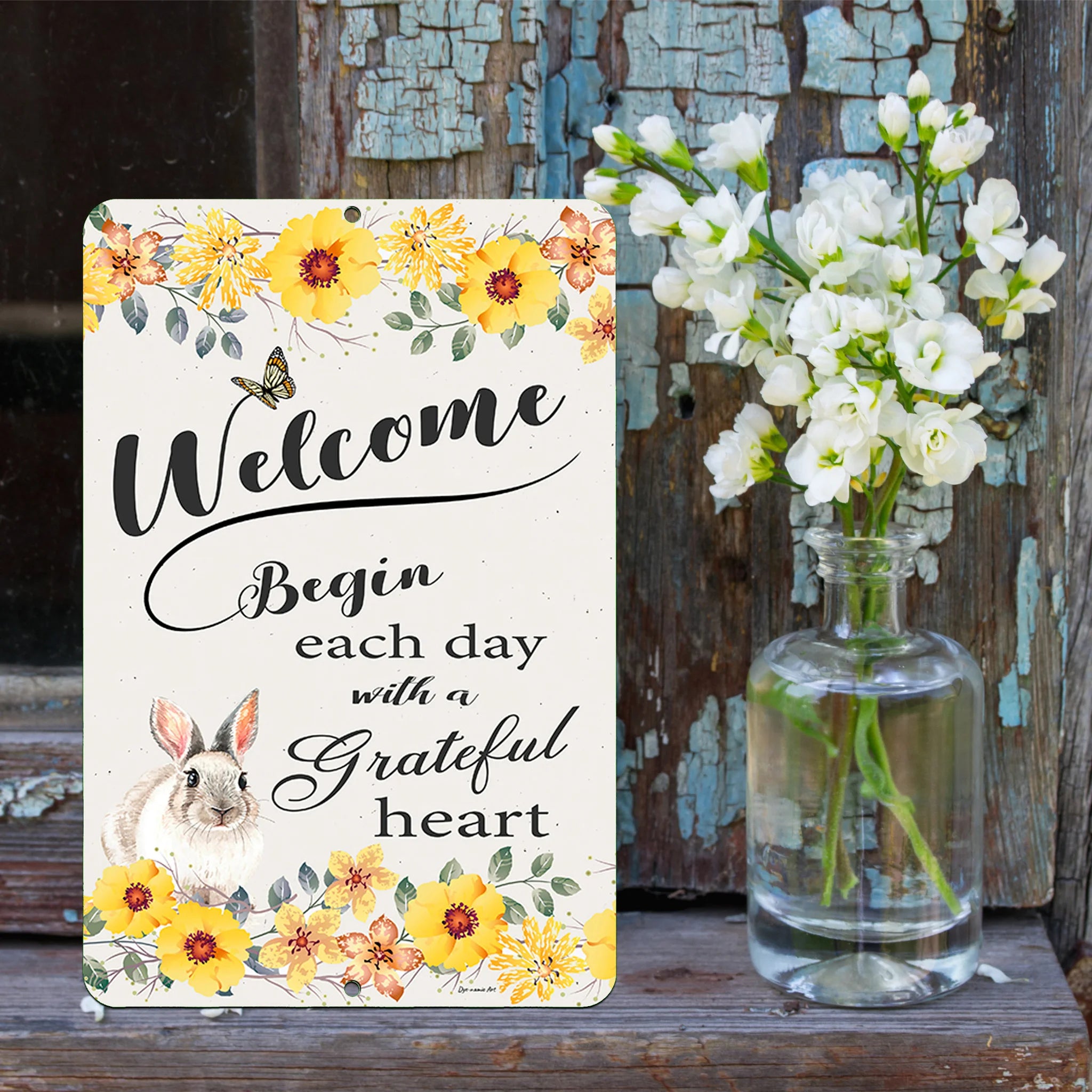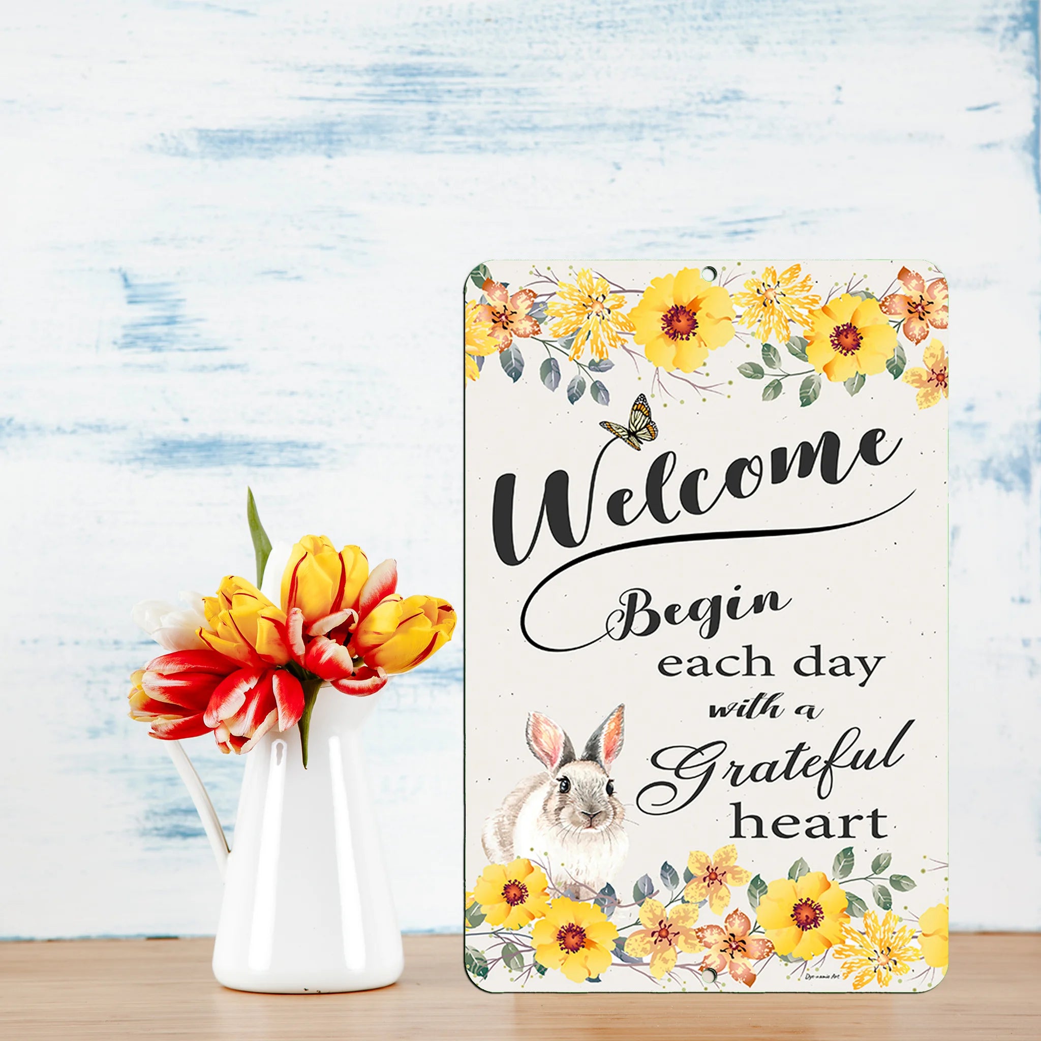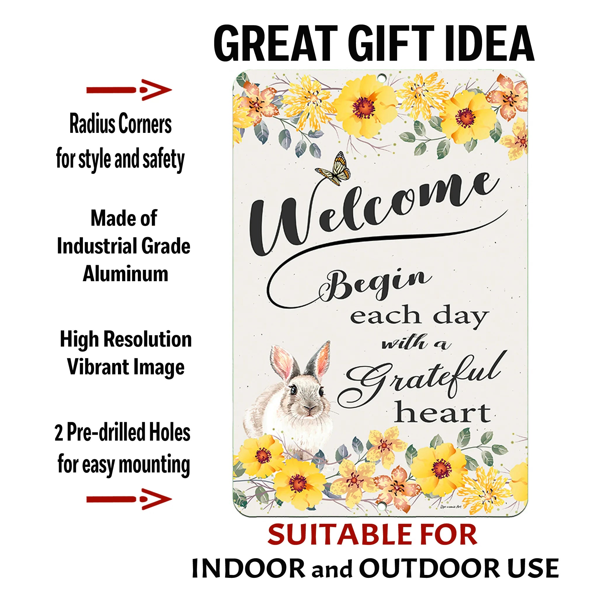 Add charm and inspiration to your space with the "Welcome Bunny Rabbit" Metal Sign, featuring a heartwarming quote and adorable rabbit illustration. This durable metal sign is perfect for welcoming guests to your home or garden while spreading positivity and gratitude.