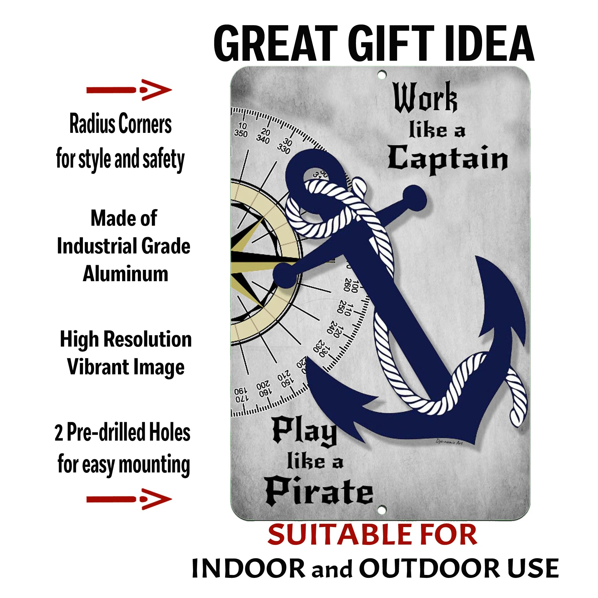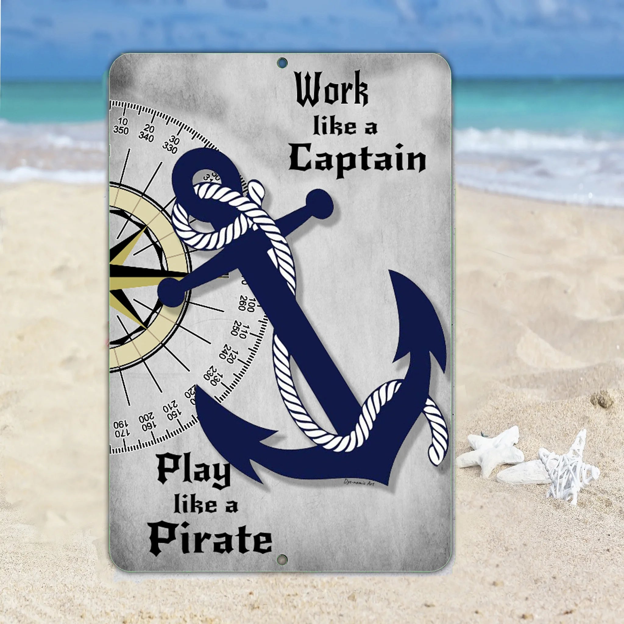 Add a touch of maritime charm and fun to your space with the "Work Like A Captain, Play Like A Pirate" nautical sign. This bold design, featuring a striking anchor and compass, is perfect for beach houses, offices, or anyone who loves the sea.